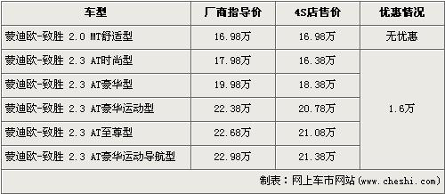 福特蒙迪歐-致勝出自福特最新開發(fā)的EUCD技術平臺,它采用了沃爾沃S80底盤技術。在歐洲,蒙迪歐致勝與皇冠成為競爭對手,是一款定位高于雅閣、凱美瑞之流的轎車。近日據(jù)網(wǎng)上車市價格系統(tǒng)檢測顯示,蒙迪歐-致勝現(xiàn)車優(yōu)惠1.6萬元,具體車型價格詳情請看下表: