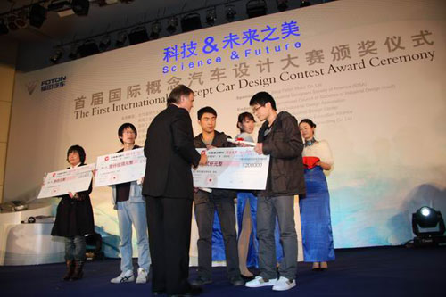 中新網(wǎng)4月29日電 日前,2010北京國(guó)際車(chē)展前一天,一場(chǎng)融匯了設(shè)計(jì)與科技的盛宴提前上演。主題為“科技&未來(lái)之美”的首屆國(guó)際概念車(chē)設(shè)計(jì)大賽,在福田汽車(chē)隆重舉行了頒獎(jiǎng)儀式。國(guó)際工業(yè)設(shè)計(jì)聯(lián)合會(huì)主席Carlos Hinrichsen、美國(guó)工業(yè)設(shè)計(jì)師協(xié)會(huì)執(zhí)行董事克萊夫•魯、福田汽車(chē)總經(jīng)理王金玉、清華大學(xué)美術(shù)學(xué)院博士生導(dǎo)師柳冠中等領(lǐng)導(dǎo)和專(zhuān)家出席了頒獎(jiǎng)儀式,來(lái)自全國(guó)各地的120多家新聞媒體記者也來(lái)到頒獎(jiǎng)現(xiàn)場(chǎng)。本次大賽共決出了“最佳和諧美感獎(jiǎng)”、“最佳創(chuàng)意未來(lái)獎(jiǎng)”、“最佳前沿科技獎(jiǎng)”三類(lèi)單項(xiàng)獎(jiǎng),以及“最具人氣獎(jiǎng)”和“最佳組織獎(jiǎng)”等獎(jiǎng)項(xiàng),而本次大賽最高獎(jiǎng)項(xiàng)“全場(chǎng)大獎(jiǎng)”被來(lái)自山東省工藝美術(shù)學(xué)院的王炎超、張知真奪得。