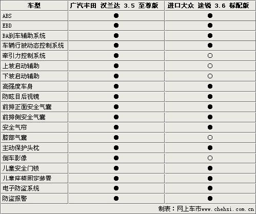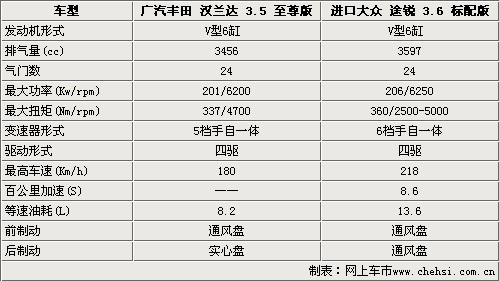 這兩款SUV車(chē)型均搭載的是V型6缸發(fā)動(dòng)機(jī),排量都在3.5升這個(gè)區(qū)間。但是在發(fā)動(dòng)機(jī)技術(shù)上卻存在著本質(zhì)區(qū)別。廣汽豐田漢蘭達(dá)的發(fā)動(dòng)機(jī)配備了雙VVT-i技術(shù),實(shí)現(xiàn)了卓越的動(dòng)力輸出,同時(shí)進(jìn)一步提高了燃油經(jīng)濟(jì)性。進(jìn)口大眾途銳則配備的是動(dòng)力更加突出FSI發(fā)動(dòng)機(jī),該發(fā)動(dòng)機(jī)采用燃油缸內(nèi)直噴技術(shù),這一點(diǎn)從最大功率和最大扭矩的輸出就可以看出。在變速器方面途銳則是略勝一籌,配備了6速手自一體變速箱,令變速更平滑順暢,該變速器還帶有DSP的智能動(dòng)力換檔系統(tǒng),能辨認(rèn)出您的變速習(xí)慣,使駕駛員充分享受到駕駛的樂(lè)趣。進(jìn)口大眾途銳剎車(chē)系統(tǒng)采用的是散熱性能良好的前后通風(fēng)盤(pán),漢蘭達(dá)采則采用的是前通風(fēng)后實(shí)心。