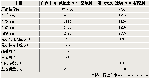 廣汽豐田漢蘭達(dá)和進(jìn)口大眾途銳均屬于一個(gè)級(jí)別的城市SUV車(chē)型,我們選取的兩款車(chē)型均是3.5排量這個(gè)級(jí)別的車(chē)型,但是在售價(jià)方面卻相差了31萬(wàn)元。在車(chē)身尺寸方面,國(guó)產(chǎn)漢蘭達(dá)在車(chē)長(zhǎng)、車(chē)高、均超過(guò)了進(jìn)口大眾途銳,這一點(diǎn)保證了其內(nèi)部頭部空間的寬敞。在軸距方面,進(jìn)口大眾途銳要比廣汽豐田漢蘭達(dá)長(zhǎng)出了65mm,這一點(diǎn)意味著途銳的腿部空間將會(huì)優(yōu)越于漢蘭達(dá)。在越野性能方面,從上表數(shù)據(jù)可以看出漢蘭達(dá)的離地間隙分別達(dá)到了203mm,接近角和離去角分別達(dá)到了29°和24°,這樣的參數(shù)應(yīng)該可以滿足一般的越野路況。越野方面進(jìn)口大眾途銳沒(méi)有提供越野參數(shù)數(shù)據(jù)。進(jìn)口大眾途銳的油箱達(dá)到了100升,使您完全沒(méi)必要去考慮長(zhǎng)途旅行沒(méi)油的問(wèn)題。