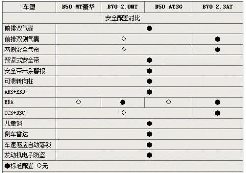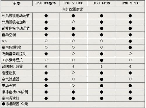 通過(guò)此項(xiàng)的對(duì)比,可以發(fā)現(xiàn)兩款兄弟車(chē)型在外觀以及內(nèi)部的絕大多數(shù)配置均極為近似,僅僅是在高配車(chē)型之上有了一些不同的豪華系統(tǒng),如B70 2.3AT豪華車(chē)型上的GPS以及DVD系統(tǒng),還有B50 AT3G版之上的多媒體娛樂(lè)系統(tǒng)等等。而B(niǎo)50全息均配備了定速巡航系統(tǒng),也是新車(chē)的一大亮點(diǎn)。