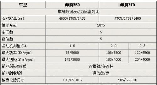 一汽奔騰新款轎車(chē)-B50即將在5月16日正式上市,作為向下擴(kuò)展的重要車(chē)型,它被一汽寄予了很大的期待。據(jù)悉,B50將推出1.6L的手動(dòng)、自動(dòng)5個(gè)型號(hào)的車(chē)型,分別為1.6L MT豪華型、1.6L AT 豪華型、1.6L MT 尊貴型、1.6L AT 尊貴型及特別的1.6L AT 3G型,這里就將這款新車(chē)與B70做一個(gè)詳細(xì)的配置對(duì)比,看看兩款兄弟車(chē)型到底區(qū)別在那里。