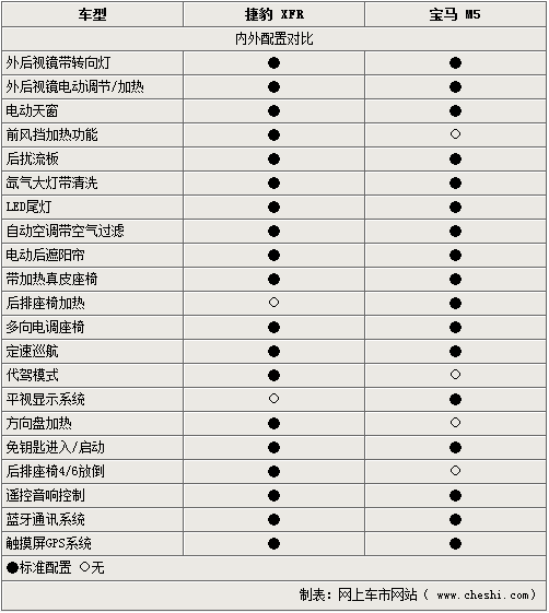 既然提到兩款車均為豪華車型,舒適配置當(dāng)然也是不能被忽視的一面。捷豹XFR則在此方面表現(xiàn)的可圈可點,多項高端配置均一一齊備。而價格相差3萬的寶馬M5在此方面則略顯遜色,看來寶馬車型更加在乎駕駛樂趣。但從此方面則證明了捷豹XFR為有機會乘坐其中的駕乘者想的更多,不僅滿足了駕駛與運動的樂趣,也可直接享受更多的舒適及便利。