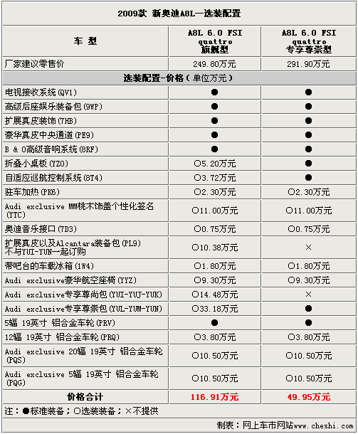 以上的選裝配置需要在預訂車輛前選擇好,經(jīng)銷商會根據(jù)客戶的訂單向廠家發(fā)送配置代碼。09款奧迪A8L的選裝配置十分豐富,完全可以滿足對配置有需求消費者的“苛刻”要求。當然,這些配置也需要不菲的金錢才可以擁有,究竟哪些配置適合有品位懂得享受的您呢?