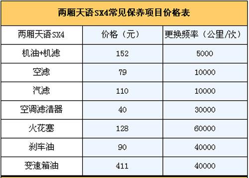 4.保養(yǎng)費(fèi):我們向長安鈴木4S店售后服務(wù)人員咨詢過,廠家規(guī)定天語SX4的首保時(shí)間為兩個(gè)月或者1500~2500公里(以先到為準(zhǔn)),正常保養(yǎng)周期為5000公里,假設(shè)一年跑2萬公里,一年則需要做保養(yǎng)4次。第一次常規(guī)保養(yǎng)(只更換機(jī)油機(jī)濾,首保免費(fèi))費(fèi)用為152元;第二次(更換機(jī)油機(jī)濾+空氣濾芯+汽油濾芯)為341元;第三次常規(guī)保養(yǎng)(更換機(jī)油機(jī)濾)152元;第四次(更換機(jī)油機(jī)濾+空氣濾芯+汽油濾芯+變速箱油)為411元,此外空調(diào)濾芯3萬公里更換,剎車油4萬公里更換,那么2年/4萬公里的保養(yǎng)費(fèi)用為2242元,平均一年兩萬公里需花費(fèi)為1121元左右。