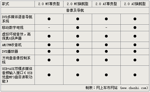 在音像及導(dǎo)航配置方面,差別同樣不大,尊貴型與旗艦型的差別只是移動(dòng)數(shù)字電視,其他如DVD導(dǎo)航及音響播放器、6喇叭揚(yáng)聲器等,應(yīng)該說是非常齊備的音響系統(tǒng)了。