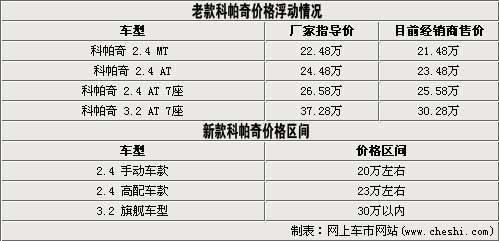 與此同時(shí),2010年開始進(jìn)口雪佛蘭科帕奇在北京市場的售價(jià)都以穩(wěn)定的優(yōu)惠幅度進(jìn)行銷售。例如2.4升車型普遍優(yōu)惠一萬元,實(shí)際售價(jià)僅為21.48-25.58萬;3.2升旗艦車型為30.28萬優(yōu)惠幅度達(dá)到7萬元。那么現(xiàn)款科帕奇在優(yōu)惠后的價(jià)格區(qū)間也恰好與內(nèi)部人士透露的新款車型上市后的價(jià)位區(qū)間相近。