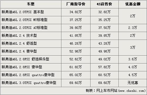 在奧迪家族中,A6L是非常重要的一款商務(wù)車型,新款?yuàn)W迪A6L通過外觀和安全等方面的改款升級(jí),在同級(jí)別車型中擁有了更高的性價(jià)比,入門級(jí)車型價(jià)格更能夠比拼寶馬5系等對(duì)手。根據(jù)網(wǎng)上車市價(jià)格監(jiān)測(cè)系統(tǒng)顯示,目前A6L最高優(yōu)惠達(dá)到了4.5萬元,具體行情如下: