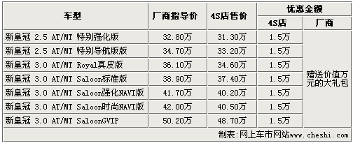 據(jù)一汽豐田銷售人員介紹:隨著新皇冠的即將上市銷售,廠商和4S店均加大了對老款皇冠的優(yōu)惠力度。目前購買這款車的消費者不僅可以享受到1.5萬的現(xiàn)金優(yōu)惠,而且廠商還會隨車贈送價值近萬元的數(shù)碼大禮包。