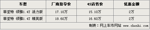 作為一款三廂緊湊型轎車,領(lǐng)雅搭載了一款1.4T渦輪增壓發(fā)動機,在同級車中較為少見。雖然菲亞特系列新車保有量比較少,但仍有眾多消費者關(guān)注目前的車型。根據(jù)網(wǎng)上車市價格監(jiān)測系統(tǒng)顯示,目前菲亞特領(lǐng)雅雖然有2萬左右的優(yōu)惠,但店內(nèi)現(xiàn)車比較緊張,具體行情如下: