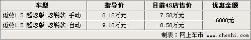 長(zhǎng)安鈴木雨燕以其圓潤(rùn)優(yōu)雅的外形,逐漸受到了消費(fèi)者的青睞,新雨燕自從上市以來,其銷售情況一直比較穩(wěn)定。由于排放問題的影響,因此1.3L雨燕在北京市場(chǎng)上已經(jīng)不再銷售。目前在北京市場(chǎng)上,購(gòu)買長(zhǎng)安鈴木雨燕1.5L超炫版炫銳款可以得到6000元的優(yōu)惠。具體車型詳見下表: