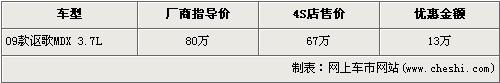 謳歌-MDX于07年4月13日于北京上市,MDX是本田高端品牌謳歌引進中國的第一輛豪華SUV車型。事隔1年有余,小改款的09款謳歌-MDX又被推出,其在08款的基礎(chǔ)上增加了一些實用性的配件,動力方面則沒有任何變動。近日據(jù)網(wǎng)上車市價格數(shù)據(jù)監(jiān)測顯示,謳歌MDX的現(xiàn)金優(yōu)惠增加到了13萬元,具體詳情請看下表:
