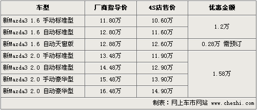 馬自達(dá)3自4月份1.6L的自動(dòng)天窗版車(chē)型上市以來(lái),一直受到消費(fèi)者關(guān)注。運(yùn)動(dòng)與操控完美結(jié)合讓馬自達(dá)3擁有較好的口碑。根據(jù)網(wǎng)上車(chē)市價(jià)格監(jiān)測(cè)系統(tǒng)顯示,馬自達(dá)3現(xiàn)最高優(yōu)惠1.58萬(wàn)元。具體行情如下: