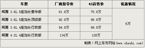 據(jù)北京進(jìn)口大眾經(jīng)銷店銷售人員介紹,目前輝騰全系有6萬元的現(xiàn)金優(yōu)惠,經(jīng)優(yōu)惠后3.6L 5座加長豪華版的售價降到了75.8萬元。排量稍大的4.2L 4座加長行政版經(jīng)優(yōu)惠后售價從134萬元下降到了128萬元。銷售人員還介紹,4.2L輝騰沒有現(xiàn)車,欲購買的消費者需交訂金10萬元預(yù)訂。