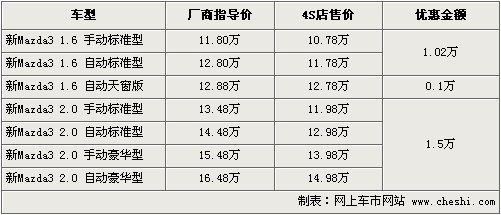馬自達(dá)3自4月份1.6L的自動天窗版車型上市以來,一直受到消費(fèi)者關(guān)注。運(yùn)動與操控完美結(jié)合讓馬自達(dá)3擁有較好的口碑。根據(jù)網(wǎng)上車市價格監(jiān)測系統(tǒng)顯示,馬自達(dá)3現(xiàn)最高優(yōu)惠1.5萬元,1.6L有少量現(xiàn)車供應(yīng)。具體行情如下: