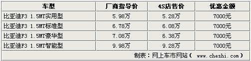 作為比亞迪汽車旗下的重點產(chǎn)品,比亞迪F3在今年又推出了智能白金版,新款車型增加了無鑰匙系統(tǒng)、智能娛樂通訊系統(tǒng)等高端配置。網(wǎng)上車市網(wǎng)站了解到,比亞迪F3智能白金版全系車型年末正在各家經(jīng)銷商店內(nèi)促銷,目前全系可給出7000元的優(yōu)惠。詳情如下: