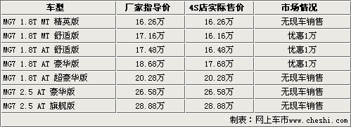 名爵作為南汽收購引入國內的品牌,在國產后保留了原汁原味的英倫風格。給平淡的中高級車市場帶來一股異域風情,其中代表車型就是名爵MG7。名爵MG7從內而外都具有英倫氣質,流線的車身設計,古典的大燈造型以及內飾中控臺的風格,從一上市就得到時尚消費者的親睞。近日根據(jù)網上車市價格監(jiān)測系統(tǒng)顯示,目前購買名爵MG7最高可以享受到1萬元的現(xiàn)金優(yōu)惠。具體車型見下表: