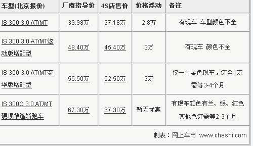 雷克薩斯IS300在原來車型基礎(chǔ)上,新推出了2010款的增配版車型,三款車增加了智能副駕駛系統(tǒng)等重量級的高端配置,但是售價并沒有明顯的變化。目前根據(jù)網(wǎng)上車市價格監(jiān)測系統(tǒng)顯示,IS300最高可優(yōu)惠現(xiàn)金3萬元,部分現(xiàn)車供應(yīng)。具體行情如下: