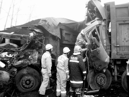 10時30分許,禹州市花石鄉(xiāng)境內(nèi)倔山村附近,兩輛滿載煤炭的大貨車相撞,4名人員受傷被困。禹州消防大隊接警后迅速趕往現(xiàn)場。由于霧大,車速受到限制,消防官兵在途中與報警人保持通話,電話指揮在場人員自救,在消防官兵趕到前,有3名被困人員成功獲救。