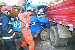 事故地點(diǎn)位于劉村紅綠燈東側(cè)100米處,現(xiàn)場一片狼藉,破碎的玻璃和汽車零部件散落一地。據(jù)目擊者透露,當(dāng)時(shí)由西向東行駛的農(nóng)用四輪車與由南向北行駛的卡車相撞,農(nóng)用四輪車的駕駛室迎頭撞上卡車左側(cè)車身,農(nóng)用車上的司機(jī)和副駕駛被卡。消防隊(duì)員一邊安慰被困人員,一邊用液壓擴(kuò)張鉗將駕駛室的變形車門打開,再從破拆的右側(cè)車門處,將被困人員救出。