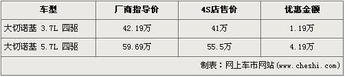 據(jù)經(jīng)銷商銷售人員介紹,目前Jeep大切諾基全系最高優(yōu)惠4.19萬元。大切諾基共分為3.7和5.7兩個(gè)排量,3.7L車型經(jīng)1.19萬元的優(yōu)惠后,售價(jià)從42.19萬元下降到了41萬元;而排量更大的5.7L車型經(jīng)4.19萬優(yōu)惠后,售價(jià)從56.69萬元下降到了55.5萬元。