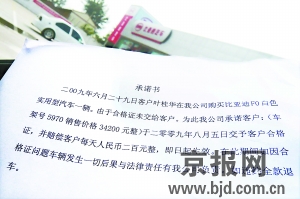 上午10時(shí)許,記者來到了位于豐臺(tái)區(qū)花鄉(xiāng)羊坊930號(hào)的金博藍(lán)汽車銷售服務(wù)公司,新車停車場(chǎng)里和展示廳內(nèi)只有4輛新車待售,偶爾還有人在看車試車。買了車卻拿不到合格證的車主陸續(xù)來到4S店,他們手中都拿著一份“承諾書”,其中承諾8月5日交付合格證,并賠償一定金額,如果違約則全款退車。