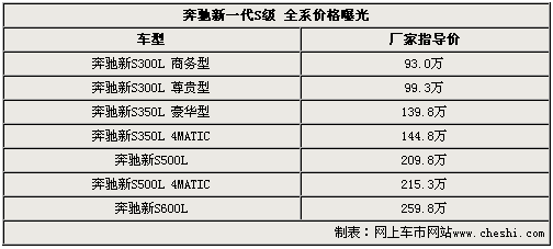 奔馳新一代S級轎車將于今晚在太廟正式上市,首推S300L商務(wù)型、S300L尊貴型、S350L豪華型、S350L 4MATIC、S500L、S500L 4MATIC和S600L共計7款車型,售價為93萬元-259.8萬元。而在上海車展全球首發(fā)的奔馳新S400L 混合動力車型,未在本次上市車型中出現(xiàn)。具體車型及售價如下表所示: