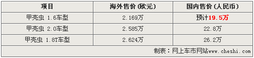 甲殼蟲在海外市場配備1.6、2.0和1.8T三個排量的多款車型,而甲殼蟲1.6作為入門級車型,其售價也最便宜。目前甲殼蟲在國內(nèi)僅有2.0和1.8T兩個排量,雖然廠家指導(dǎo)價為22.8萬和26.2萬,但實(shí)際市場售價均可優(yōu)惠3萬元左右。通過國內(nèi)外相同排量車型的售價可以看出,甲殼蟲1.6引入國內(nèi)的售價預(yù)計(jì)為19.5萬元左右。