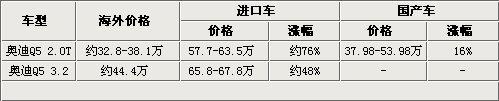 從以上表格中我們可以看到,奧迪Q5在海外的售價約合人民幣32.8-44.4萬元,旗下的2.0TFSI和3.2FSI車型以進口的形式進入國內(nèi)后,價格分別有了76%和48%的漲幅。但隨后奧迪Q5選擇了國產(chǎn),以此來降低奧迪Q5的成本和價格。我們看到,國產(chǎn)后的奧迪Q5價格漲幅只有16%,比進口車型下降了很多。