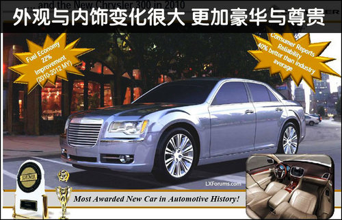 新克萊斯勒300C將會在明年迎來新的春天,新款車型在外觀與內(nèi)飾都有多處改進。據(jù)得到的一些消息稱2011款300C會在燃油經(jīng)濟性上改進19%,而且在娛樂裝備系統(tǒng)上也將會達到一個新的水平。馬力上方面會有克萊斯勒的Phoenix V6發(fā)動機與HEMI V8發(fā)動機兩種,高端的SRT8版本依然存在。在安全裝備方面包括有盲區(qū)監(jiān)測系統(tǒng),ESC,能源回收型的轉向柱,后側車身加固結構等。