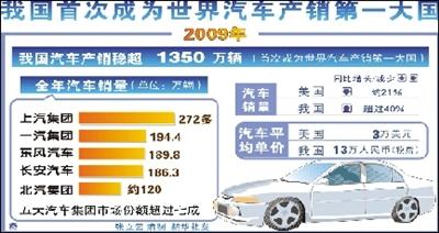 中國汽車技術研究中心首席專家黃永和10日對記者說,2009年中國汽車產銷超過1350萬輛,首次成為世界汽車產銷第一大國。他預計2010年中國汽車產銷會超過1500萬輛,跨國汽車公司將從中繼續(xù)受益。據(jù)新華社電
