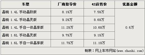 據(jù)4S店銷售人員介紹:目前晶銳全系優(yōu)惠6000元,最低僅售7.59萬。晶銳目前現(xiàn)車較為充足,顏色較齊全,個(gè)別車型無現(xiàn)車,顏色不齊全。如需要預(yù)訂車輛,最短需等2周時(shí)間,最長(zhǎng)需等一個(gè)半月。如在店內(nèi)購(gòu)車做裝飾可獲8折優(yōu)惠,可保證裝飾產(chǎn)品質(zhì)量。