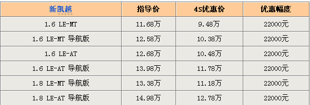 筆者日前走訪北京上海通用4S店時(shí)獲悉,目前新凱越優(yōu)惠再升2000元,達(dá)到了最高2.2萬元的讓利,這也是去年以來最高的優(yōu)惠記錄。由于現(xiàn)在新凱越庫(kù)存車較多,顏色齊全,對(duì)這款車感興趣的消費(fèi)者近期可以出手了。
