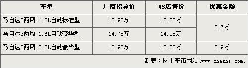 據(jù)經(jīng)銷商處銷售人員介紹,目前馬自達(dá)3兩廂有1.6L和2.0L兩種排量共三款車型在售。馬自達(dá)3兩廂2.0L車型優(yōu)惠為9000元,1.6L車型優(yōu)惠為7000元。經(jīng)7000元的優(yōu)惠后,1.6L自動(dòng)標(biāo)準(zhǔn)型和1.6L自動(dòng)豪華型售價(jià)仍為13.28萬元和14.08萬元,全系最高配的2.0L自動(dòng)豪華型經(jīng)9000元的優(yōu)惠后,售價(jià)為16.08萬元。