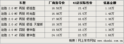 北京現(xiàn)代途勝是一款兼顧越野和城市兩種風(fēng)格的SUV車型,其經(jīng)濟(jì)實(shí)用性表現(xiàn)突出。途勝的整車設(shè)計不僅時尚,各個細(xì)節(jié)還體現(xiàn)出設(shè)計者對城市SUV實(shí)用性的把握。根據(jù)網(wǎng)上車市價格監(jiān)測系統(tǒng)顯示,目前途勝全系優(yōu)惠幅度均有一定程度變化,具體車型以及價格如下: