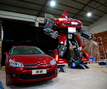 中新網(wǎng)4月15日電 2009上海國際車展即將開幕,除了輪番轟炸的多款新車和概念車外,又有重磅消息傳來。據(jù)悉,此前曾攜東風(fēng)雪鐵龍C2機器人“大鬧”廣州車展的南京車迷,這次又有大動作。一個高達(dá)4.5米、寬4米、厚3米、整體重量近2噸,帶聲、光、電系統(tǒng),以東風(fēng)雪鐵龍世嘉車為原形、結(jié)合中國傳統(tǒng)龍文化的巨型汽車人已經(jīng)在南京誕生,而且極有可能于上海車展現(xiàn)身。