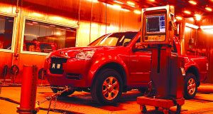 一輛風(fēng)駿皮卡安靜地停在一間大房子內(nèi),天花板上的幾臺高功率射燈讓它看上去光彩照人。但過不了多久,這些大燈就會讓風(fēng)駿暴露在強(qiáng)烈的“熱帶陽光”之下,接下來,這輛倒霉的實(shí)驗(yàn)車可能還要在模擬行駛的狀態(tài)下接受從零上40度到零下60度環(huán)境溫度變化的考驗(yàn)。