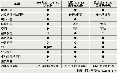 東風(fēng)標(biāo)致旗下的全新A0級(jí)轎車-兩廂標(biāo)致207于昨日(3月18日)以7.18—10.48萬(wàn)元的價(jià)格正式上市。兩廂標(biāo)致207作為三廂標(biāo)致207的延伸車型,在繼承了三廂車型優(yōu)點(diǎn)的同時(shí),又添加了許多運(yùn)動(dòng)因素。那么剛剛上市的兩廂標(biāo)致207究竟有什么特點(diǎn)呢?市場(chǎng)競(jìng)爭(zhēng)力究竟如何呢?為了能讓消費(fèi)者更加清楚地了解這款新車,我們選取了兩款目前市場(chǎng)上比較暢銷的日系兩廂A0級(jí)轎車飛度和雅力士,通過(guò)與其參數(shù)和配置的全方位對(duì)比,讓消費(fèi)者您對(duì)兩廂標(biāo)致207有個(gè)了解。