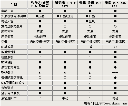 上述四款車型都屬于該車系中的頂配車型,所以在舒適配置方面可謂是應(yīng)有盡有,電動(dòng)天窗、真皮座椅、自動(dòng)雙區(qū)空調(diào)、多功能方向盤等設(shè)備都成為了標(biāo)準(zhǔn)配置。但仔細(xì)看下來(lái),天籟•公爵的全景天窗比較突出,這是同級(jí)別車型中很少可以看見的。在娛樂(lè)方面,天籟•公爵的11揚(yáng)聲器系統(tǒng)比較突出,音像水平完全達(dá)到了發(fā)燒的級(jí)別。而雅閣的硬盤系統(tǒng)顯示出了它的科技感。四款車型中,只有天籟•公爵沒有配備GPS衛(wèi)星導(dǎo)航系統(tǒng)外。