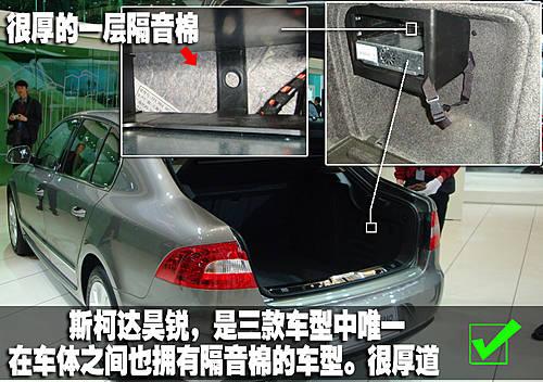 打開(kāi)行李箱后我們通常可以在一些“隱蔽”的地方發(fā)現(xiàn)一臺(tái)車的細(xì)節(jié)做工,例如這部分對(duì)比中您將看到斯柯達(dá)-昊銳在三款車型中獨(dú)有的“車輛內(nèi)側(cè)隔音棉”。