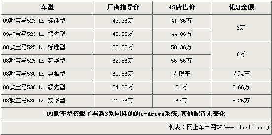 據(jù)4S店銷售人員介紹,寶馬5系各款車型優(yōu)惠金額均不同,最高優(yōu)惠達到了8.26萬。目前在售的523 Li車型全部為09款,其與新3系搭載了同樣的i-drive系統(tǒng),經(jīng)2萬元優(yōu)惠后,09款523 Li標(biāo)準(zhǔn)型與領(lǐng)先型售價分為降價為41.36萬元和44.86萬元。525 Li標(biāo)準(zhǔn)型和豪華型經(jīng)6萬元優(yōu)惠后售價降為50.36萬元和56.56萬元。530 Li豪華型的優(yōu)惠金額達到了全系最高的8.26萬元,售價也降到了71.26萬元。