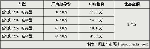 新寶馬3系在去年12月份正式在國(guó)內(nèi)市場(chǎng)正式上市銷售,經(jīng)過(guò)改款后的3系從外觀的流線,到內(nèi)飾的風(fēng)格均有一定程度的變化,帶給消費(fèi)者的是全新的視覺(jué)沖擊和駕馭樂(lè)趣。根據(jù)網(wǎng)上車市價(jià)格監(jiān)測(cè)系統(tǒng)顯示,新寶馬3系車型全系出現(xiàn)了2.7萬(wàn)元的現(xiàn)金優(yōu)惠,具體車型價(jià)格如下: