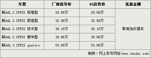 據(jù)北京地區(qū)奧迪經(jīng)銷店銷售人員介紹,目前選購(gòu)?qiáng)W迪新A4L的消費(fèi)者可以以原廠商指導(dǎo)價(jià)購(gòu)買,店內(nèi)取消了加價(jià)1萬(wàn)才可提車。在售的新A4L分為5款車型,售價(jià)區(qū)間為29.88萬(wàn)元-53.88萬(wàn)元。銷售人員還介紹,新A4L的內(nèi)飾分灰色、黑色和米色三種,一般車色均配以米色和灰色內(nèi)飾,只有紅色車身的新A4L配以黑色內(nèi)飾。