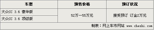 大眾CC自去年廣州車展亮相后一直受到消費者廣泛關注,此前有關這款車的詳細參數和配置已經曝光。大眾CC將搭載3.6FSI燃油直噴引擎和6速DSG雙離合變速箱,將分豪華版和頂級版兩款。根據網上車市價格監(jiān)測系統(tǒng)顯示,目前這款車有望在下月到店,4S店開始接受消費者預訂,具體行情如下:
