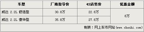 據(jù)經(jīng)銷商銷售人員介紹,威達(dá)全系現(xiàn)金優(yōu)惠8萬元。目前歐寶威達(dá)僅2.2L舒適版和2.2L豪華版兩款車型在銷售,經(jīng)優(yōu)惠8萬元后,2.2L豪華型售價(jià)降到了27.8萬元,2.2L舒適型首次跌破23萬,售價(jià)僅為22.8萬元。現(xiàn)車的數(shù)量一般顏色也不是很齊全,消費(fèi)者挑選的余地很受限制。