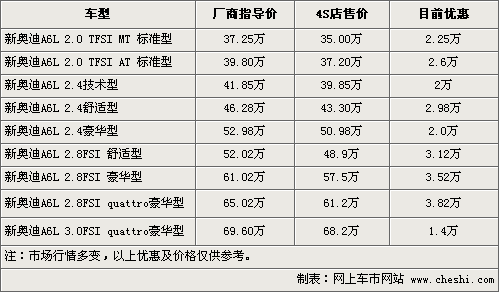 新款奧迪A6L通過外觀和安全等方面的改款升級,在同級別車型中擁有了更高的性價比,入門級車型價格更能夠比拼寶馬3系等對手。根據(jù)網(wǎng)上車市價格監(jiān)測系統(tǒng)顯示,目前奧迪A6L全系優(yōu)惠幅度有進一步增加,2.0入門車優(yōu)惠后僅售35萬,具體車型以及價格如下: