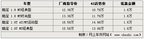 酷寶系列車型,不僅外形時(shí)尚,動力也相當(dāng)充沛,不僅可與進(jìn)口跑車如蓮花競速相媲美,也帶動了自主跑車市場的競爭。近期網(wǎng)上車市網(wǎng)站了解到,隨著市場競爭的加劇,現(xiàn)在各家4S店均可給出全系16000元的現(xiàn)金優(yōu)惠,令此車型再次引起關(guān)注。具體詳情如下: