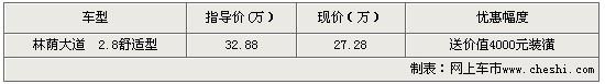 據(jù)林蔭大道銷(xiāo)售人員表示,購(gòu)買(mǎi)林蔭大道 2.8舒適型除了可以得到最高5.6萬(wàn)元的價(jià)格優(yōu)惠外,商家還在每輛車(chē)銷(xiāo)售的同時(shí)還搭配汽車(chē)裝潢贈(zèng)品。商家現(xiàn)在展廳有黑色和炭晶兩款現(xiàn)車(chē)。更多詳情隨時(shí)聯(lián)系經(jīng)銷(xiāo)商。