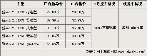 據(jù)北京地區(qū)奧迪經(jīng)銷店銷售人員介紹,近期購買奧迪A4L的消費者可以以原廠商指導價購買,提現(xiàn)車不再需要多交1萬元現(xiàn)金。在售的新A4L分為5款車型,售價分別為:2.0T標準型為29.88萬元、2.0T舒適性為32.99萬元、2.0T技術(shù)型為36.18萬元、2.0T為38.86萬元、3.2Quattro為53.88萬元。銷售人員還介紹,新A4L的內(nèi)飾分灰色、黑色和米色三種,一般車色均配以米色和灰色內(nèi)飾,只有紅色車身的新A4L配以黑色內(nèi)飾,店內(nèi)只有紅色車型數(shù)量不多,欲購買其他顏色的消費者需交定金1萬元,約等1個月后提車。