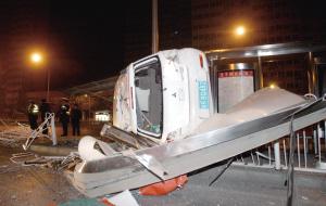 事發(fā)后,現(xiàn)場的兩條機動車道被封鎖,10多米長的護欄已被撞倒,公交站亭一半被撞毀。白色三菱車頭嚴(yán)重變形,側(cè)翻在輔路上。目擊者李先生說,當(dāng)時該車在主路上行駛,撞毀公交站亭后側(cè)翻,男司機從車內(nèi)自行爬出,渾身帶著酒氣。
